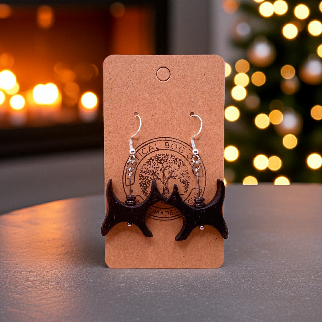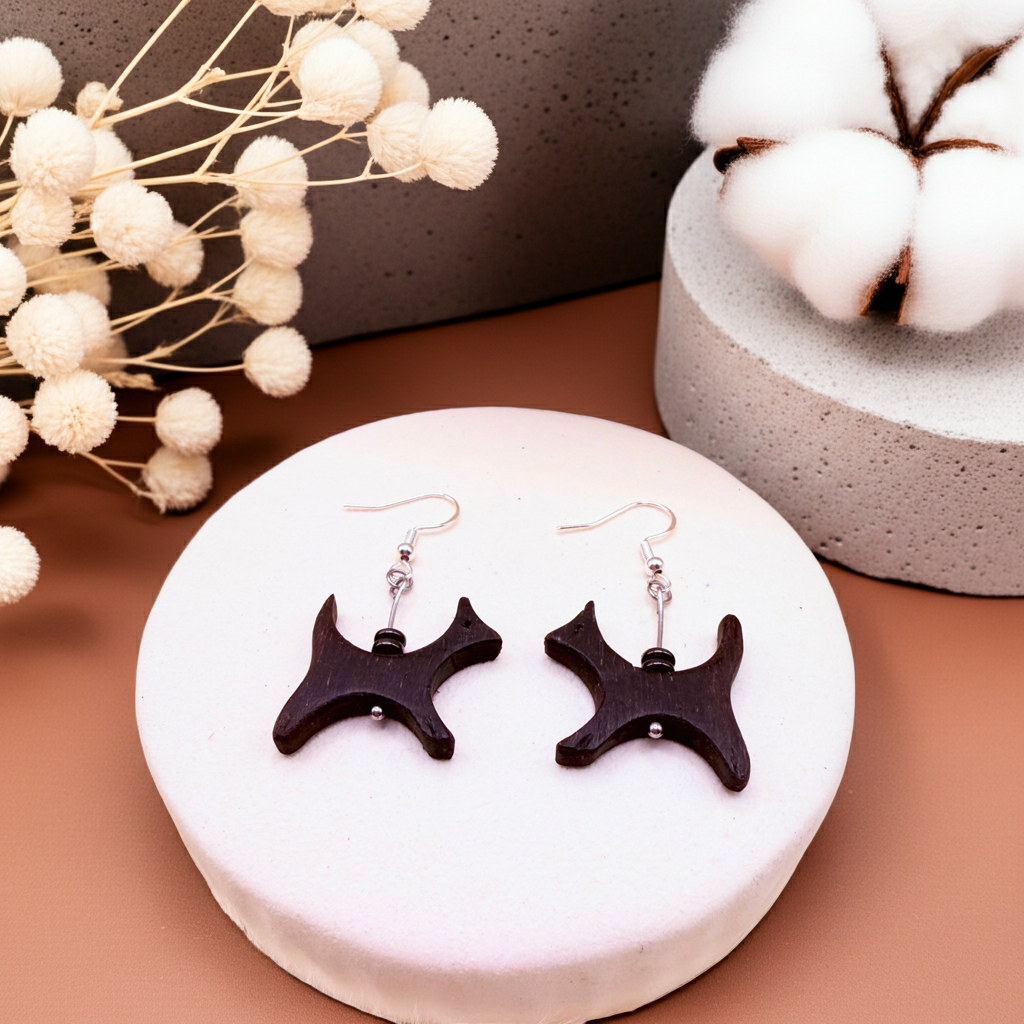 These unique earrings feature an eye-catching abstract cat-like silhouette, handcrafted from ancient bog oak. The shape is modern and expressive, adding a touch of character and artistic flair to your everyday style. Lightweight and comfortable to wear, they offer a bold statement without feeling heavy on the ear.