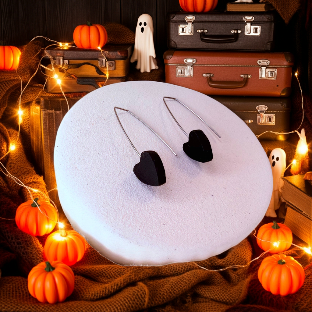 Minimalist Bog Oak Heart Earrings – Handmade Long Hook Design